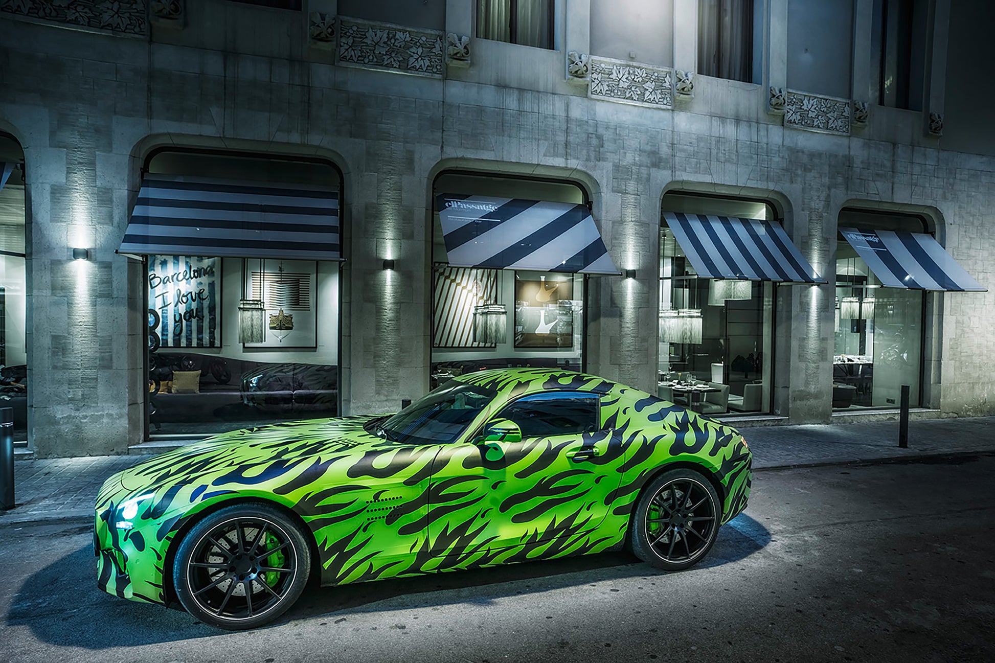The acrylic glass picture, photographed by Markus Bolsinger, shows a sports car in the city center, covered in green foil with black details. The photograph radiates elegance and has a brilliant effect. Perfect for car lovers and fans of the urban lifestyle. An eye-catcher in every room.