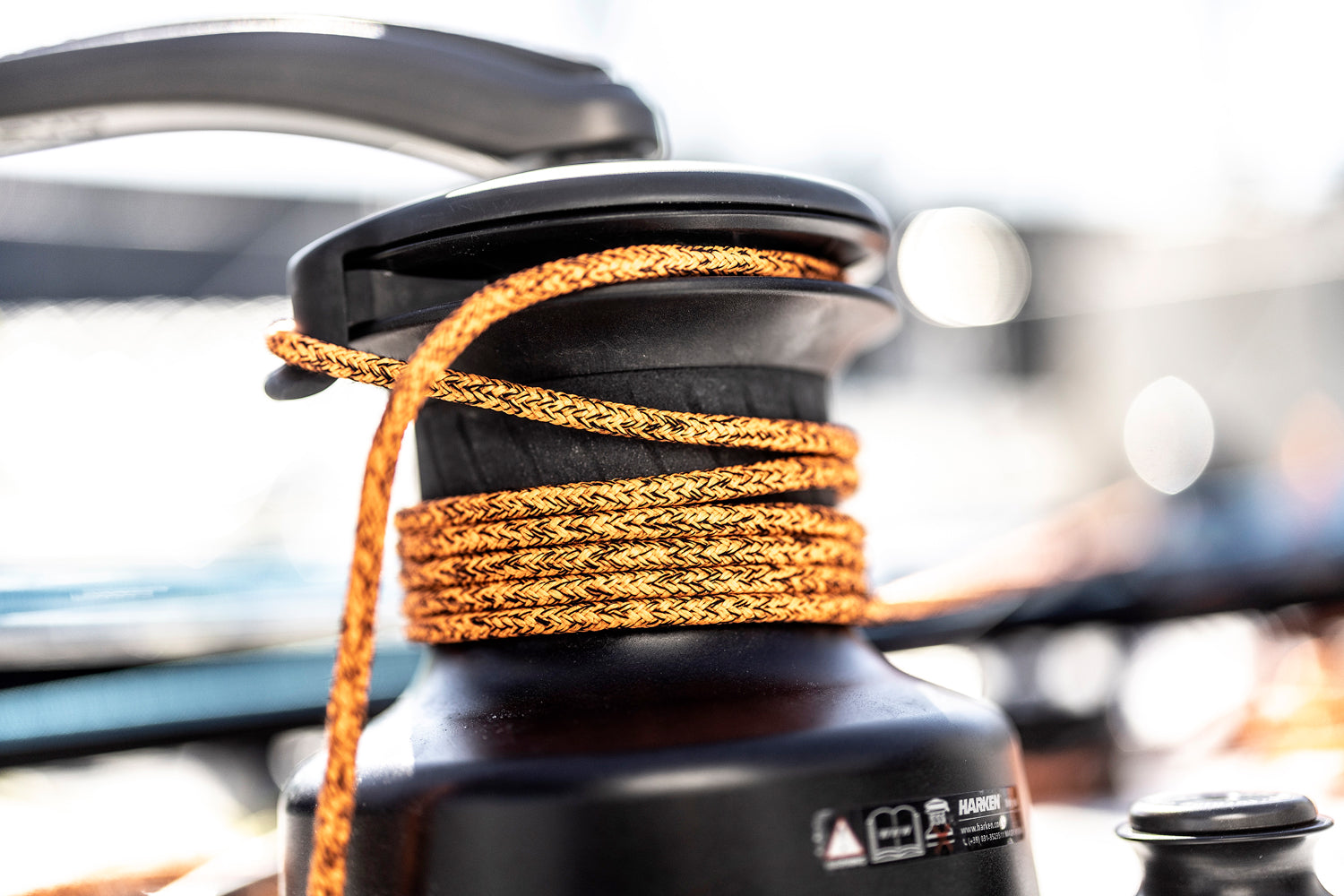 Die Nahaufnahme zeigt eine detailreiche Ansicht einer straff belegten Schot, die auf einer Winsch fixiert ist. Sie verhindert, dass sich das Segel im Wind auf die andere Seite wirft und hält es stabil auf Kurs. Das robuste Tauwerk und die metallischen Elemente der Winsch stehen klar im Fokus und vermitteln die technische Präzision des Segelns. Die Fotografie stammt von Andreas Lindlahr, der mit seinem Blick für maritime Details die unmittelbare, authentische Atmosphäre an Bord einfängt.
