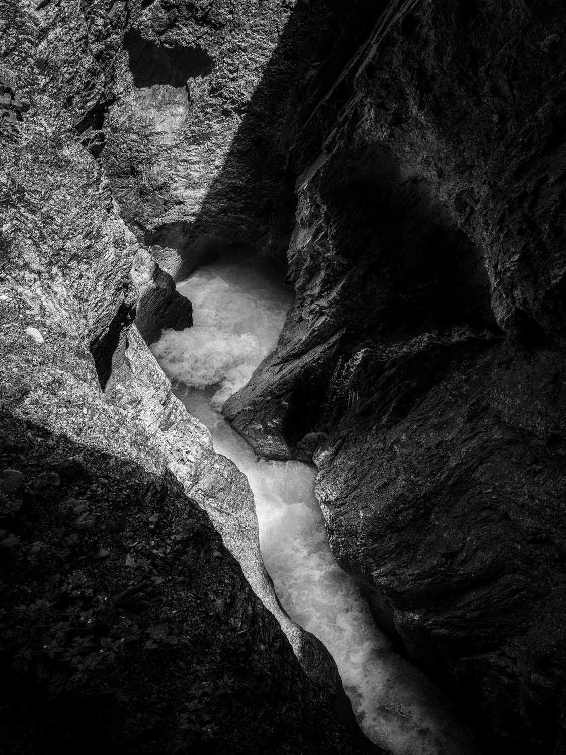 Die Schwarzweiß-Fotografie von Thorsten Doerk zeigt eine beeindruckende Naturkulisse: Eine enge Klamm, durch die sich Wasser zwischen den imposanten Felsen schlängelt. Das Spiel von Licht und Schatten verstärkt die Dramatik der Szene. Die raue Schönheit der Natur wird durch die monochrome Darstellung besonders betont. Der Fotograf hat es geschafft, die wilde und unberührte Seite der Natur einzufangen und in einem eindrucksvollen Bild festzuhalten.