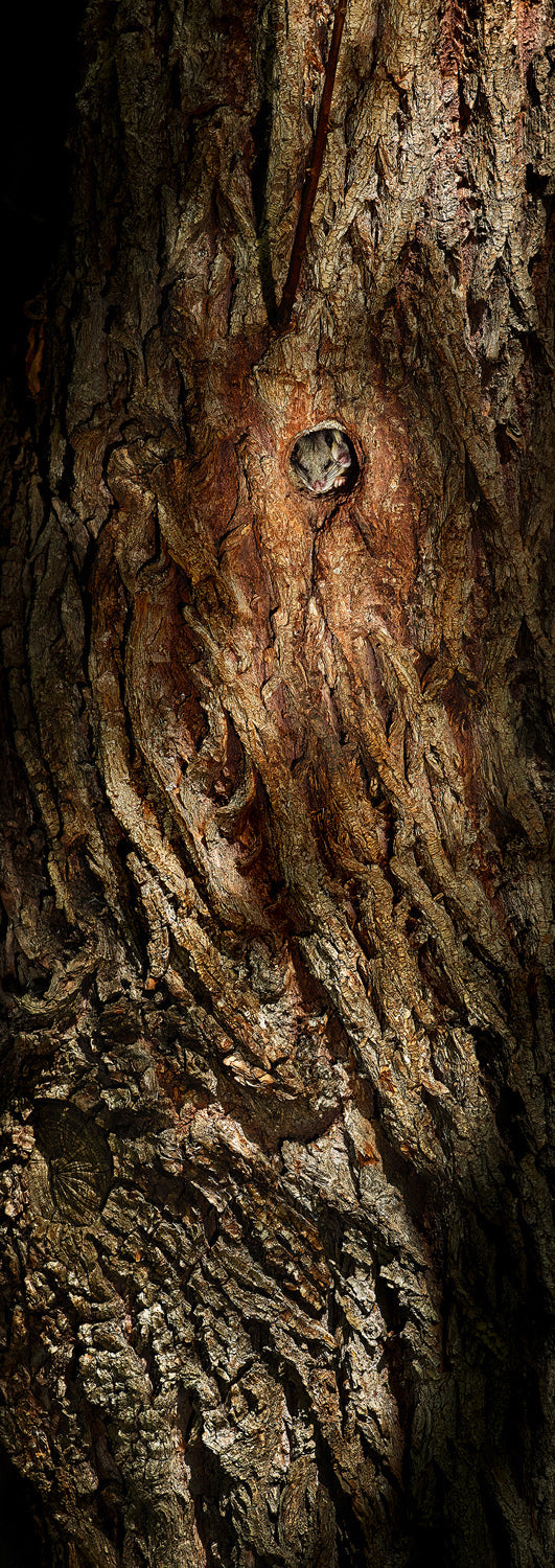 Sandra Martens' acrylic glass print depicts nature at its most beautiful. Focusing on tree bark and wood, the photographer captures the moment a curious mouse peeks out of a hole. The image exudes elegance and has a particularly sophisticated feel thanks to its brilliant rendering. An eye-catcher for any room.