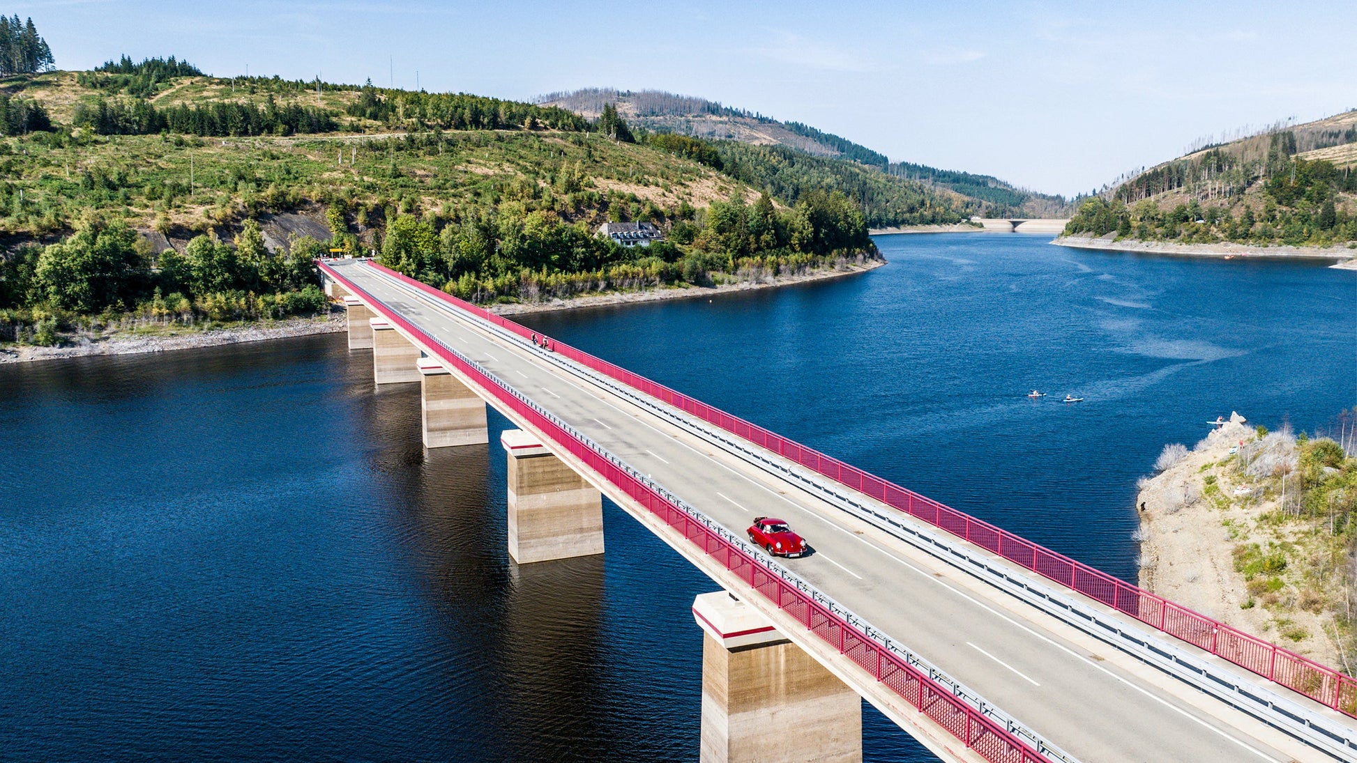 The acrylic glass image, photographed by Jörg Weusthoff, depicts a breathtaking aerial view of a bridge with a red vintage car against a bright blue sky. The brilliant image adds a touch of sophistication to any room.