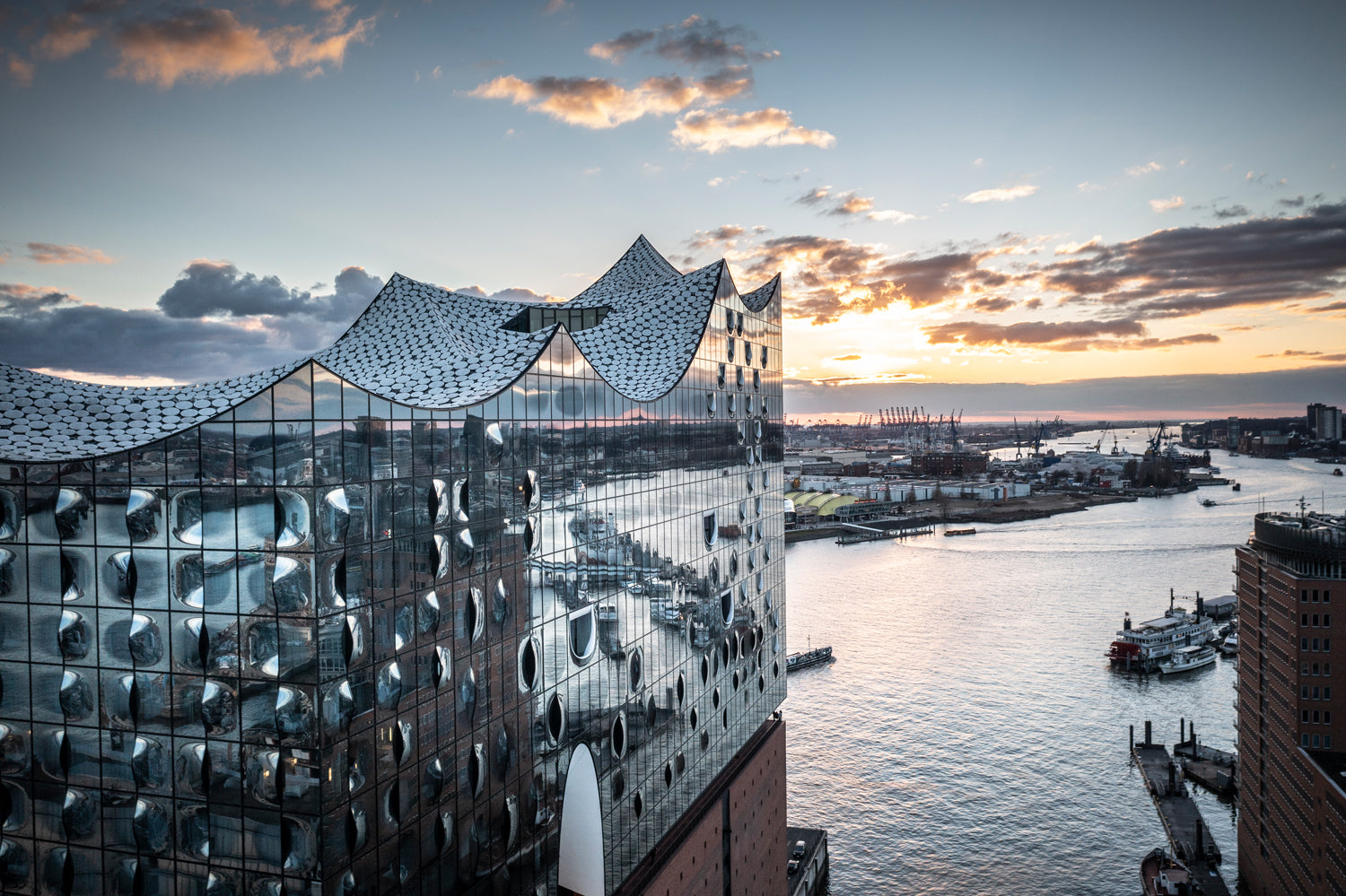 Die Fotografie von Andreas Lindlahr zeigt die imposante Architektur der Elbphilharmonie in Hamburg aus der Vogelperspektive, aufgenommen mit einer Drohne. Das moderne Gebäude mit seiner wellenförmigen Glasfassade und dem markanten Dach ragt majestätisch in den Himmel. Die Sonne spiegelt sich in den Fenstern und verleiht dem Bauwerk einen goldenen Glanz. Im Vordergrund erstreckt sich die Elbe, die das Gebäude malerisch umrahmt. Die Aufnahme fängt die Schönheit und Eleganz dieses architektonischen Meisterwerks perfekt ein.